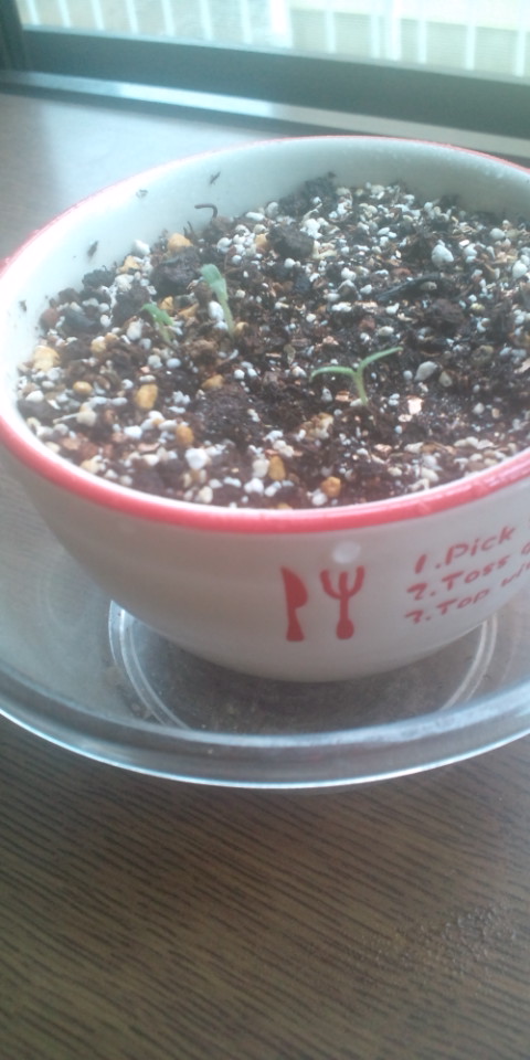 トマトを植えて芽が出た。